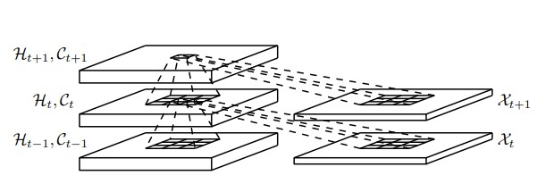 At every step of the ConvLSTM, the future state of a pixel position is predicted by the inputs and past states of its local neighbours (figure shown below). The neigbouring dependencies that this convolution step will measure will depend on the size of the convolution kernel used. For example, if states were hidden representations of moving objects, then larger transition kernels would better capture faster motions (variance across larger areas) and smaller kernels would better capture slower motions (variance across smaller areas).