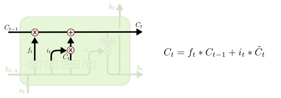 Update: the result of the input gate and the previous time step's cell state are fed into the update gate, where the LSTM module forget what needs to be forgotten and memorizes what needs to be remembered. This will update the cell's memory, .